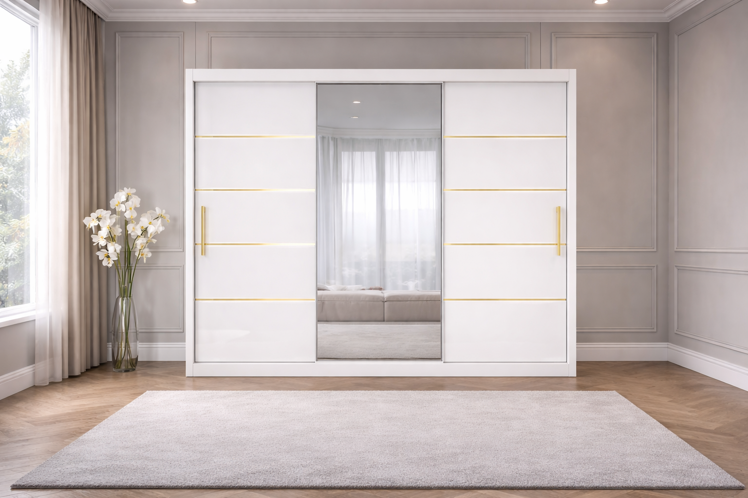 Dressingul Georgia din MDF lucios aduce un plus de eleganță și luminozitate în orice dormitor. Finisajul lucios reflectă frumos lumina, oferind încăperii un aspect mai spațios și rafinat, iar liniile aurii decorative completează perfect designul sofisticat. Sistemul de glisare asigură funcționalitate și economie de spațiu.