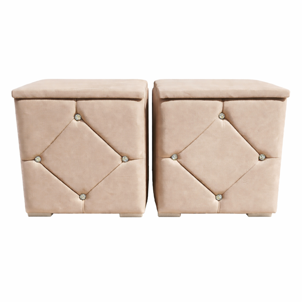 Elegante și rafinate, aceste noptiere tapițate cu stofă de înaltă calitate adaugă un plus de stil oricărui dormitor. Modelul geometric decorativ și accentele cu nasturi cristal oferă un aspect sofisticat, iar structura solidă garantează durabilitate în timp.