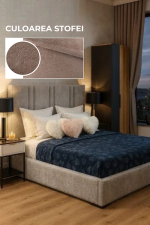 Acest pat tapițat impresionează prin designul modern și materialele de înaltă calitate,