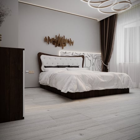 Patul se remarcă prin structura sa rezistenta și tăblia tapițată în stofă albă, cu detalii capitonate. Forma curbată a tăbliei și combinația contrastantă de culori oferă dormitorului un aspect rafinat și contemporan.