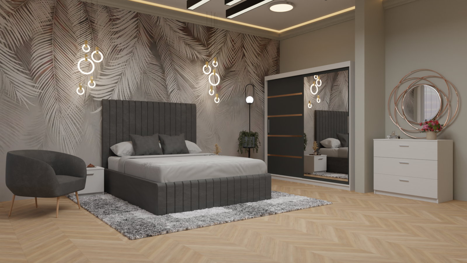 Dormitor Cairo cu Pat Tapitat cu dressing 200*200 usi glisante Alb&Gri Antracit, noptiere si comoda