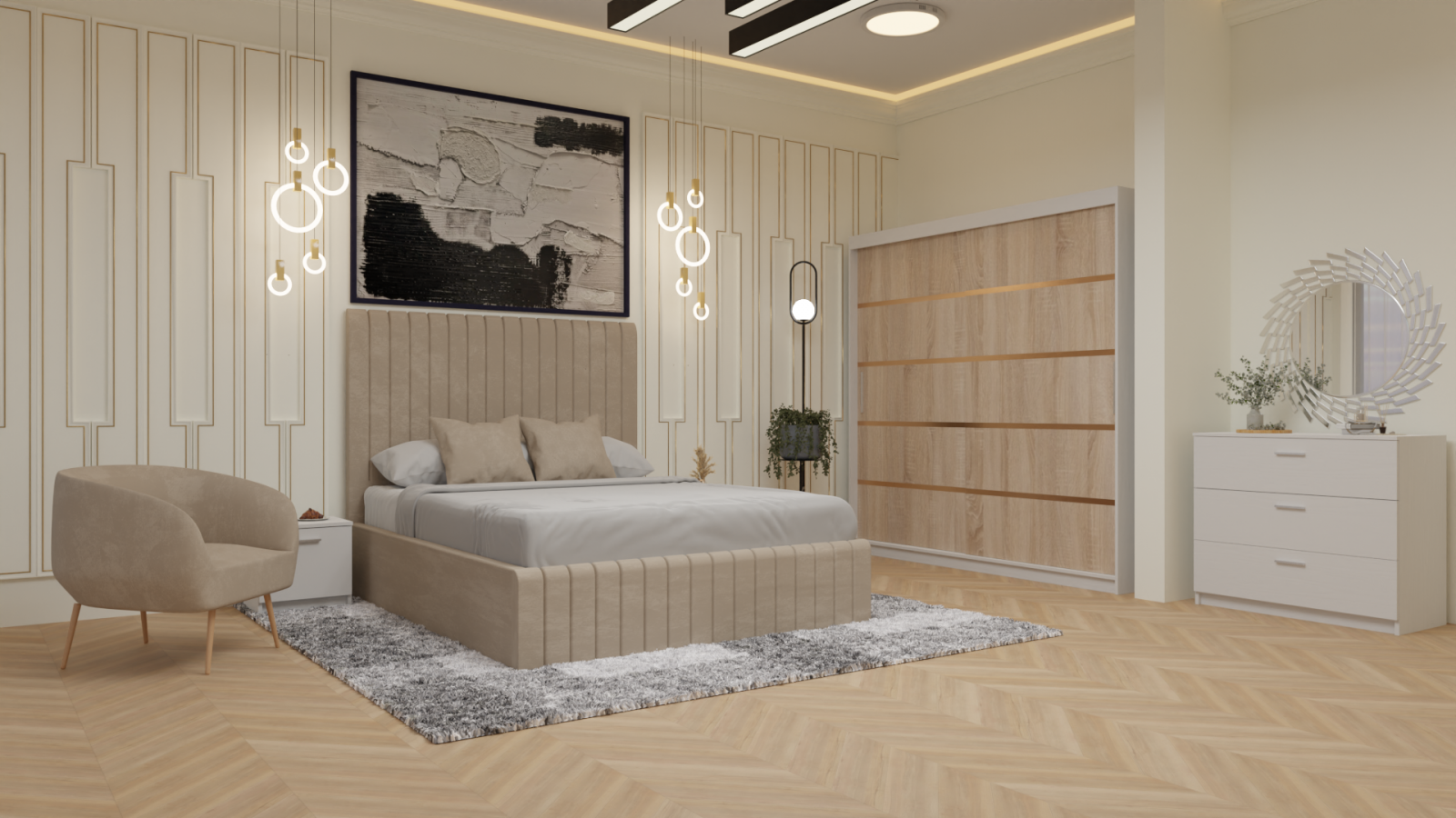 Dormitor Cairo cu Pat Tapitat cu dressing 200*200 usi glisante Alb&Sonoma , noptiere si comoda