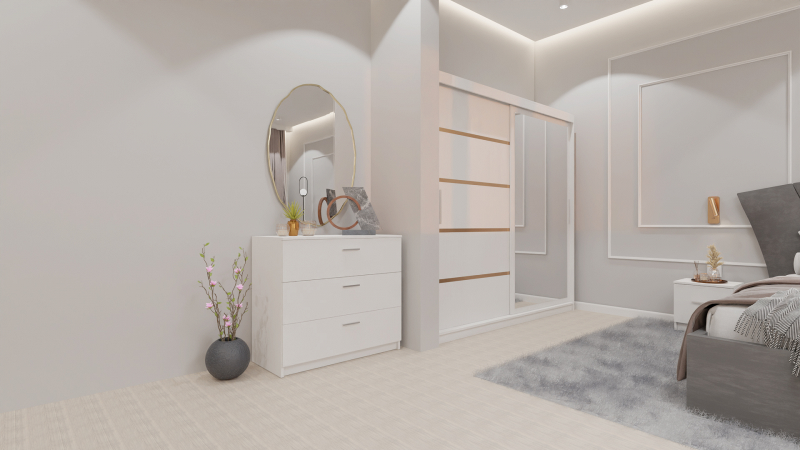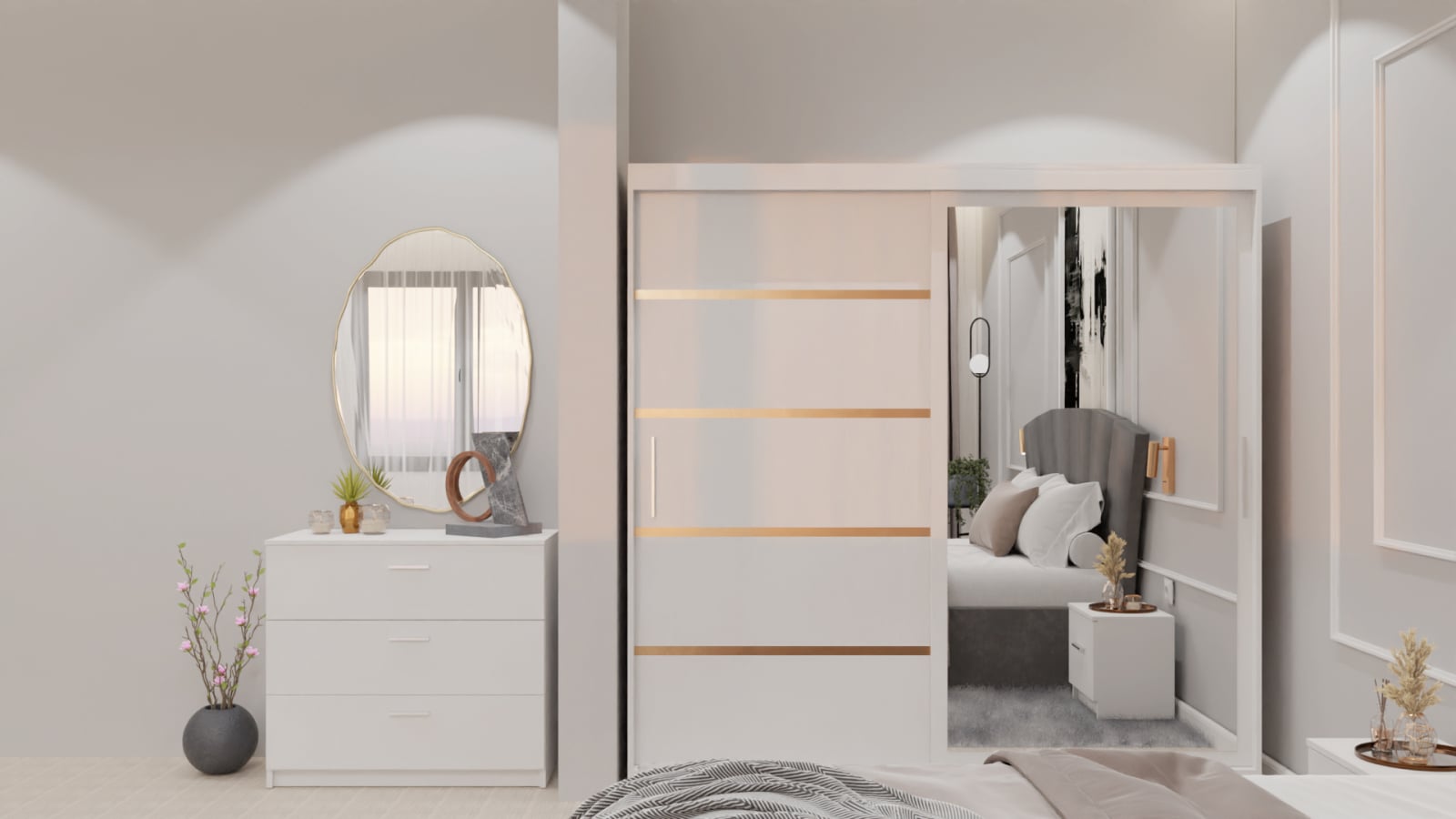 Dormitor Lucas cu Pat Tapitat Stofa Gri cu dulap 200*200 usi glisante Alb cu oglinda , noptiere si comoda