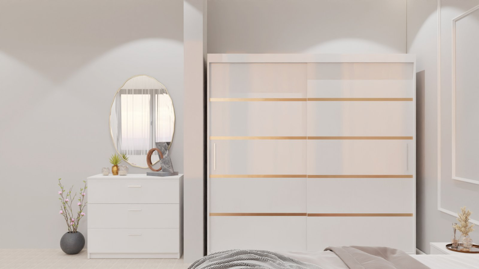 Dormitor Lucas cu Pat Tapitat Stofa Roz cu dulap 200*200 usi glisante Alb , noptiere si comoda