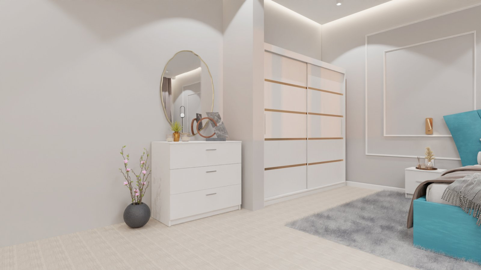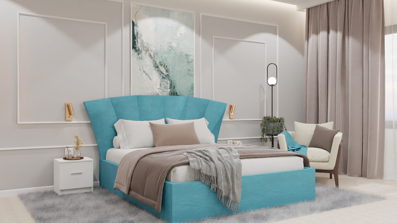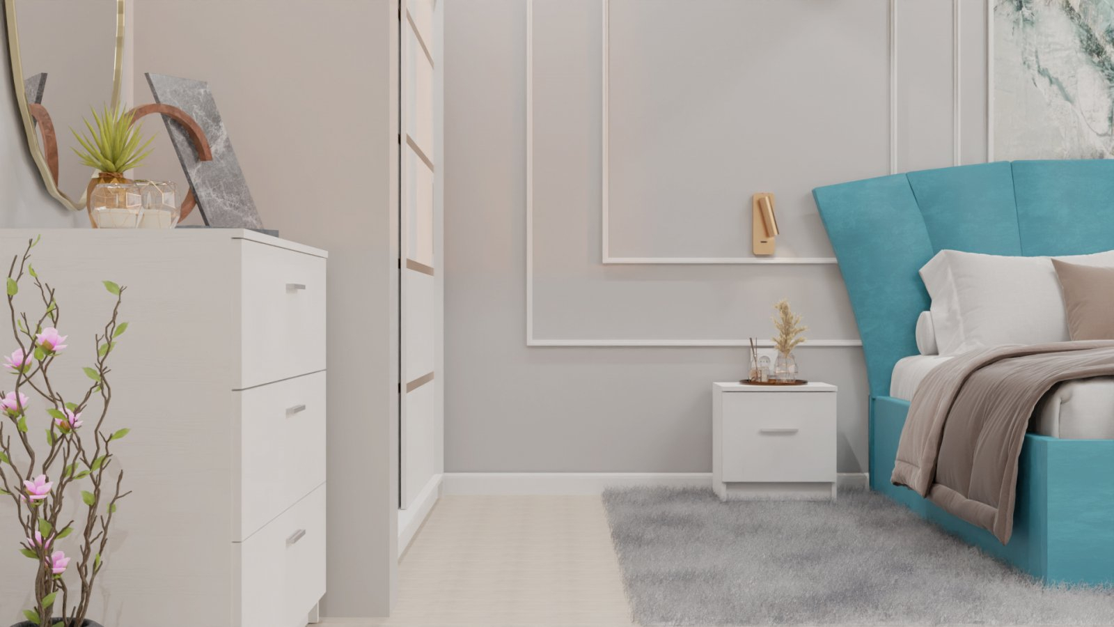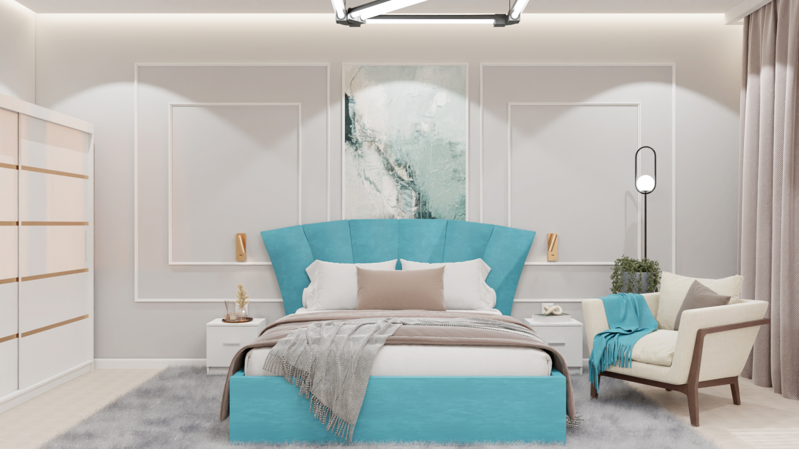 Dormitor Lucas cu Pat Tapitat Stofa Turcoaz cu dulap 200*200 usi glisante Alb , noptiere si comoda
