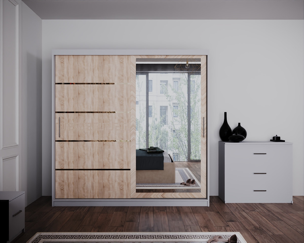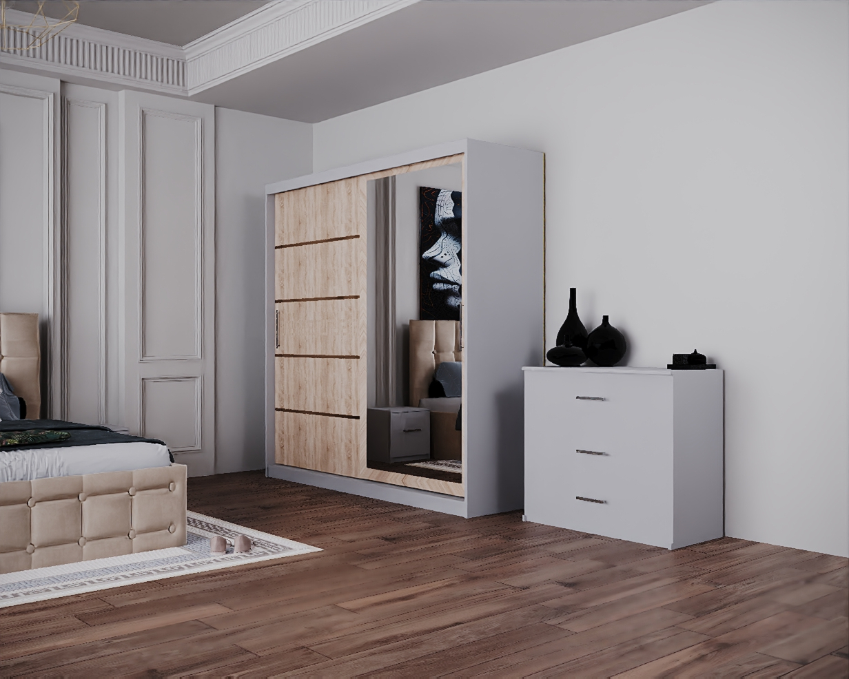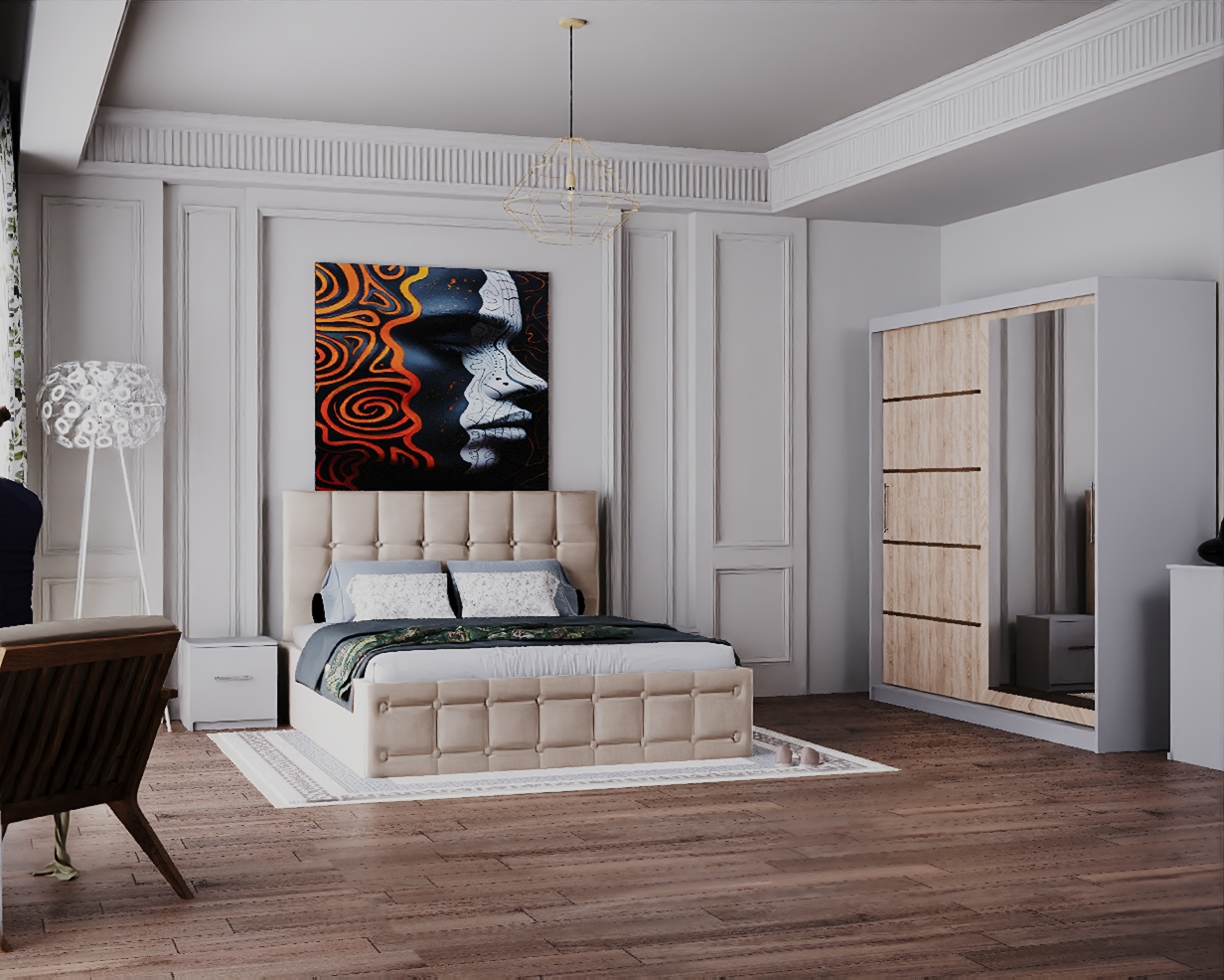 Dormitor Regal cu Pat Tapitat Stofa Bej cu dulap 200*200 usi glisante Sonoma&Alb cu Oglinda, noptiere si comoda