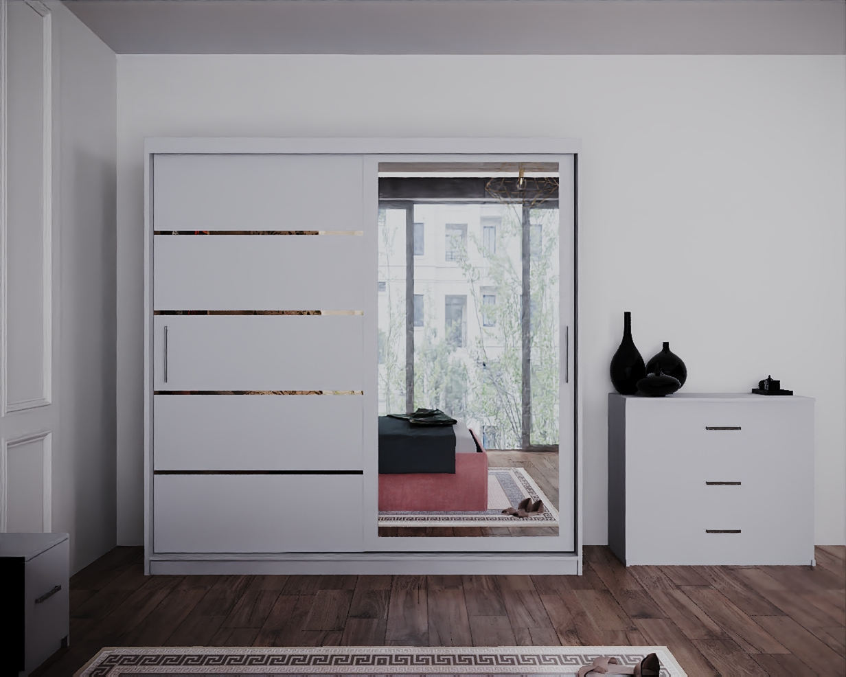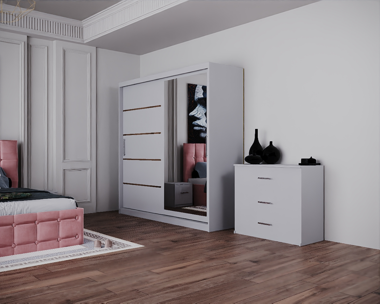 Dormitor Regal cu Pat Tapitat Stofa Roz cu dulap 200*200 usi glisante Alb cu Oglinda, noptiere si comoda