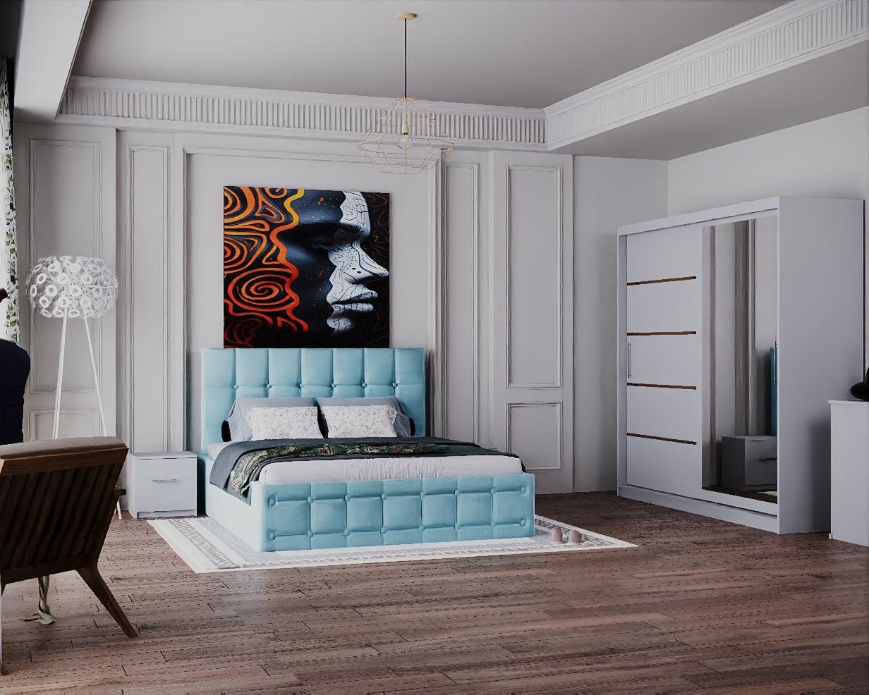 Dormitor Regal cu Pat Tapitat Stofa Turcoaz cu dulap 200*200 usi glisante Alb cu Oglinda, noptiere si comoda