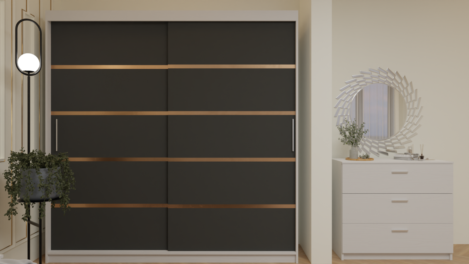 Dormitor Cairo cu Pat Tapitat  cu dressing 200*200 usi glisante Alb&Gri Antracit, noptiere si comoda