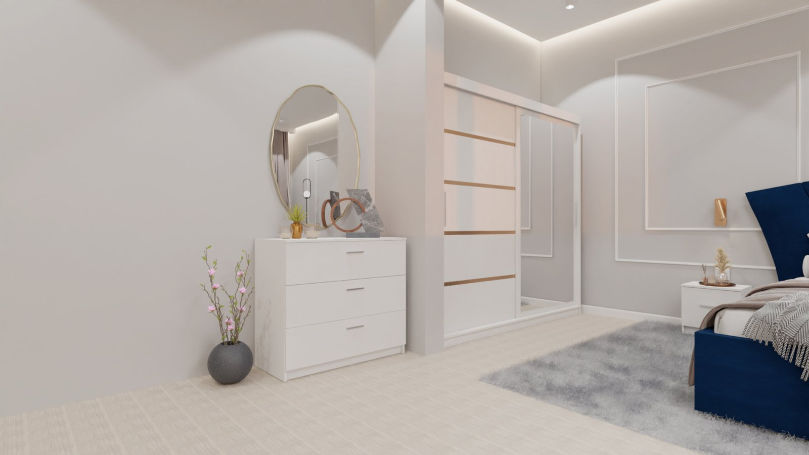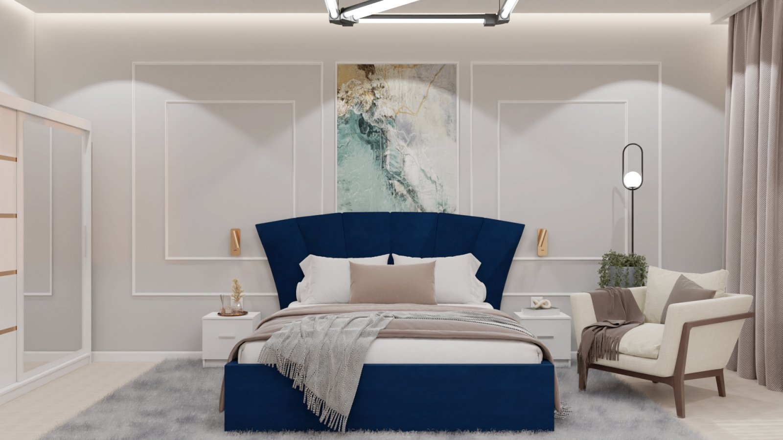 Dormitor Lucas cu Pat Tapitat Stofa Albastru cu dulap 200*200 usi glisante Alb , noptiere si comoda