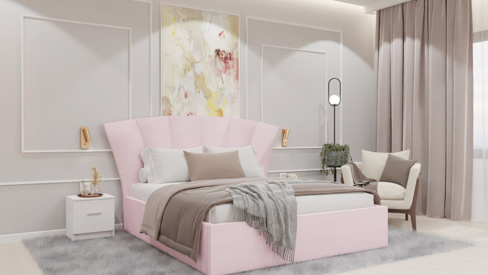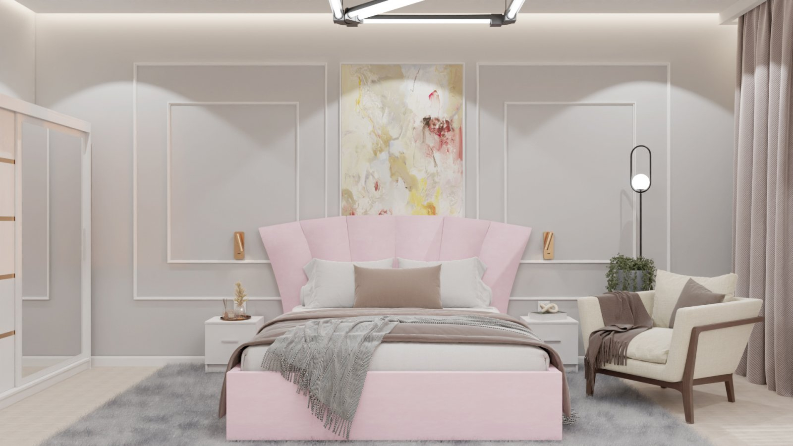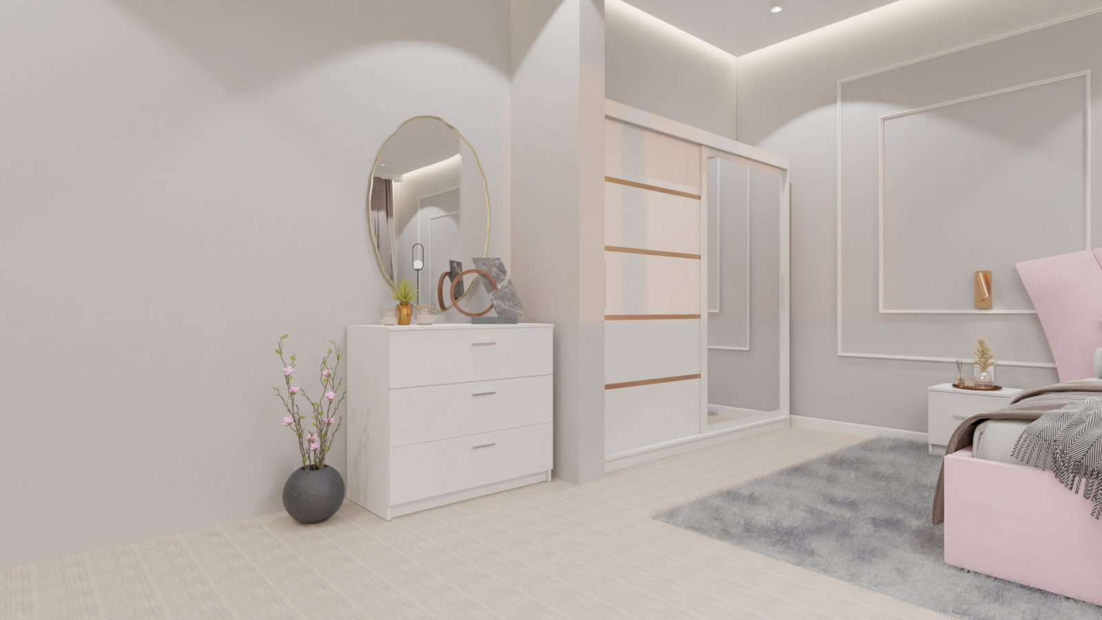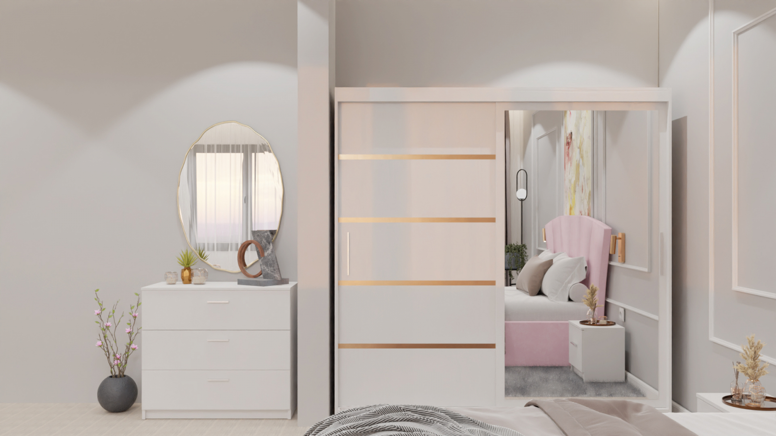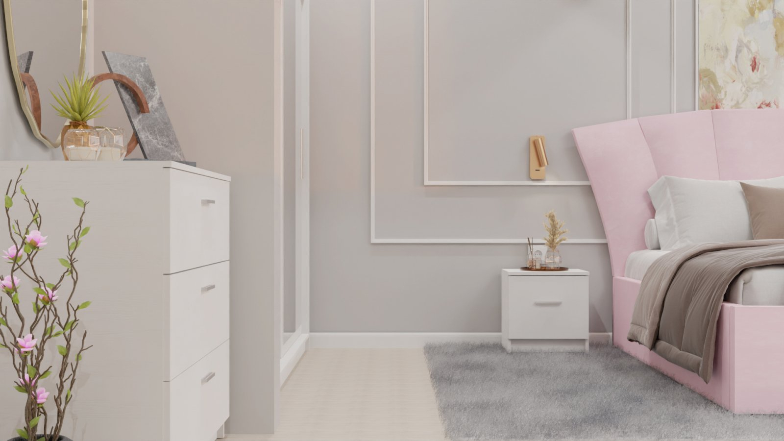 Dormitor Lucas cu Pat Tapitat Stofa Roz cu dulap 200*200 usi glisante Alb cu oglinda , noptiere si comoda