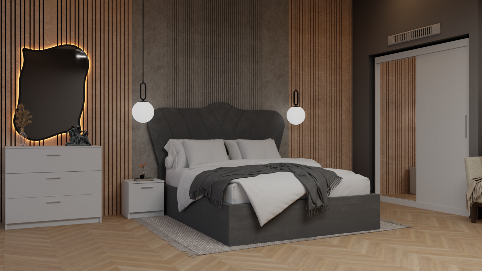 Dormitor Queen Pat Tapitat Dressing 2 Usi Cu Oglinda Alb