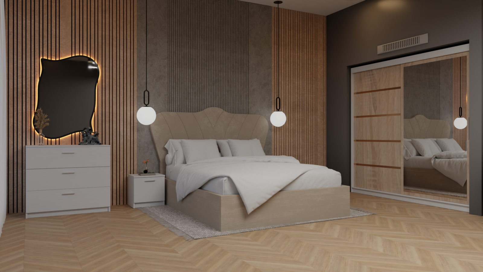 Dormitor Queen cu Pat Tapitat  cu dressing 200*200 usi glisante Alb&Sonoma cu Oglinda , noptiere si comoda