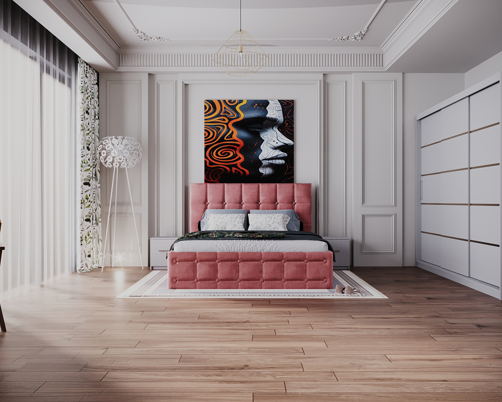 Dormitor Regal cu Pat Tapitat Stofa Roz cu dulap 250*200 usi glisante Alb, noptiere si comoda