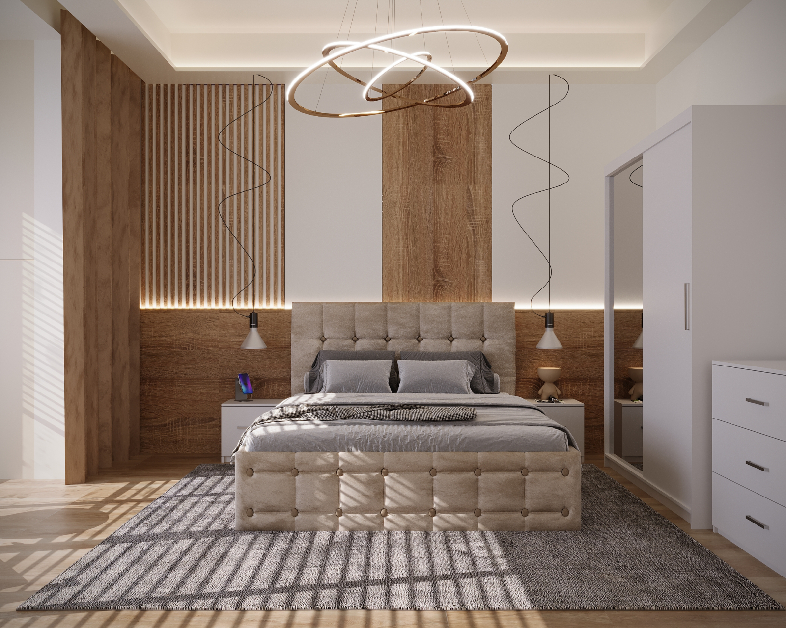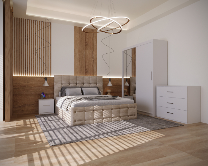 Dormitor Regal cu Pat Tapitat Stofa Bej cu dulap usi glisante Alb cu oglinda, noptiere si comoda
