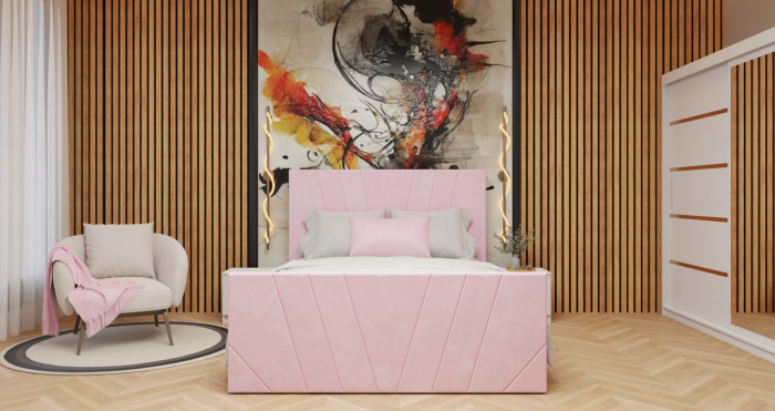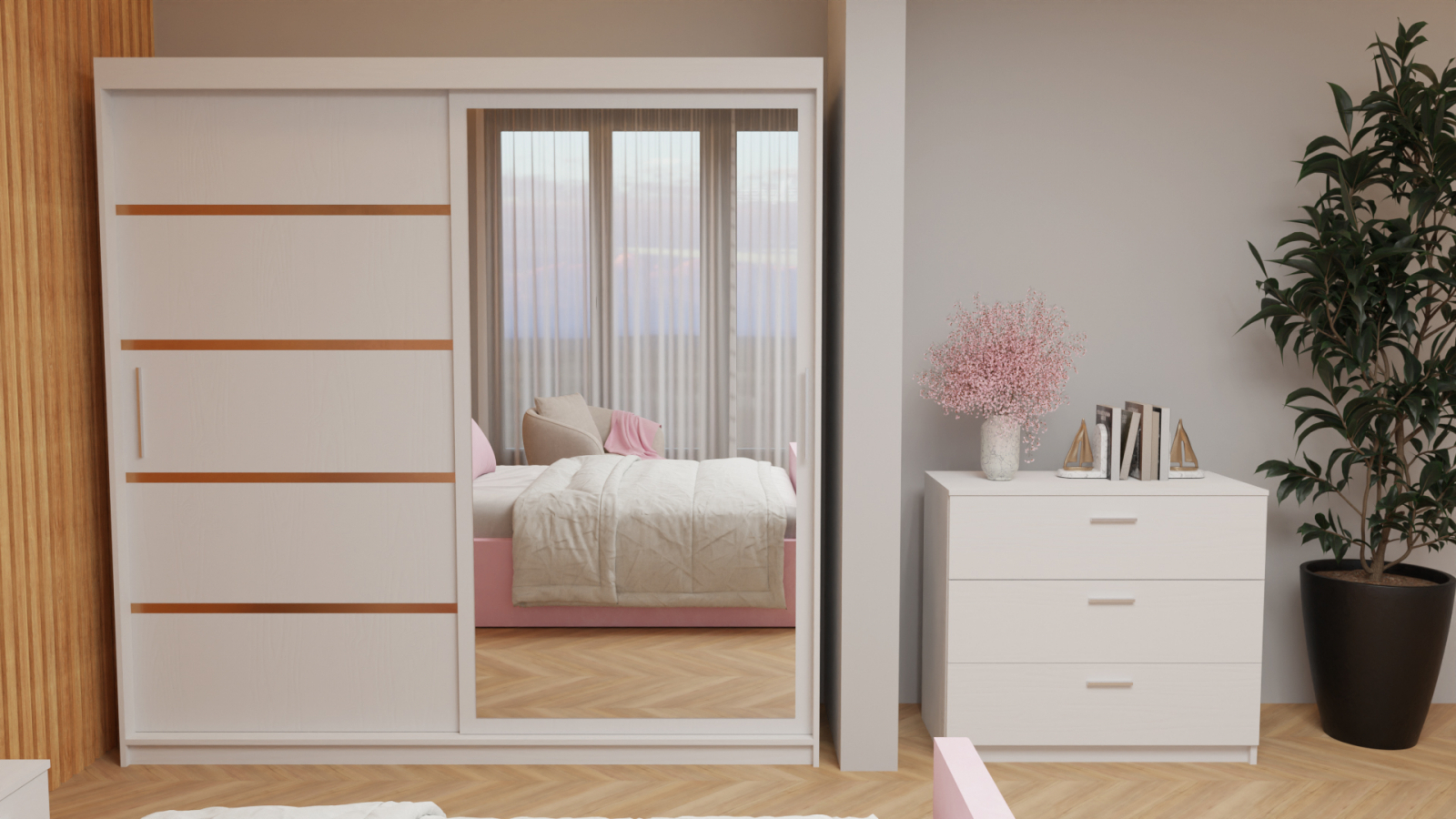 Dormitor Tony Tapitat Stofa Roz cu dulap 200*200 usi glisante Alb cu Oglinda, noptiere si comoda