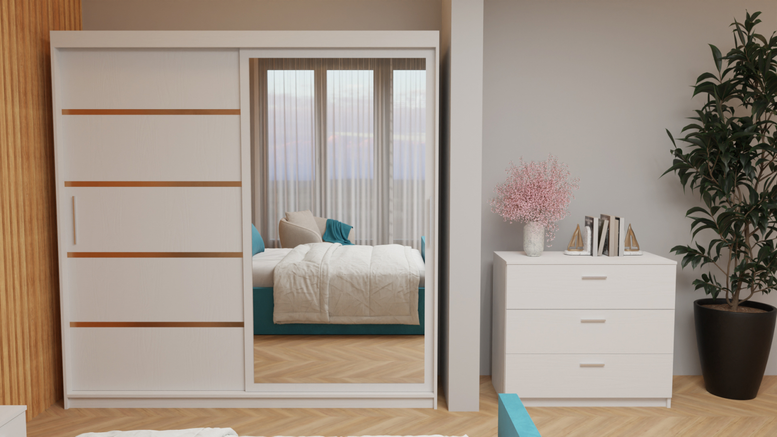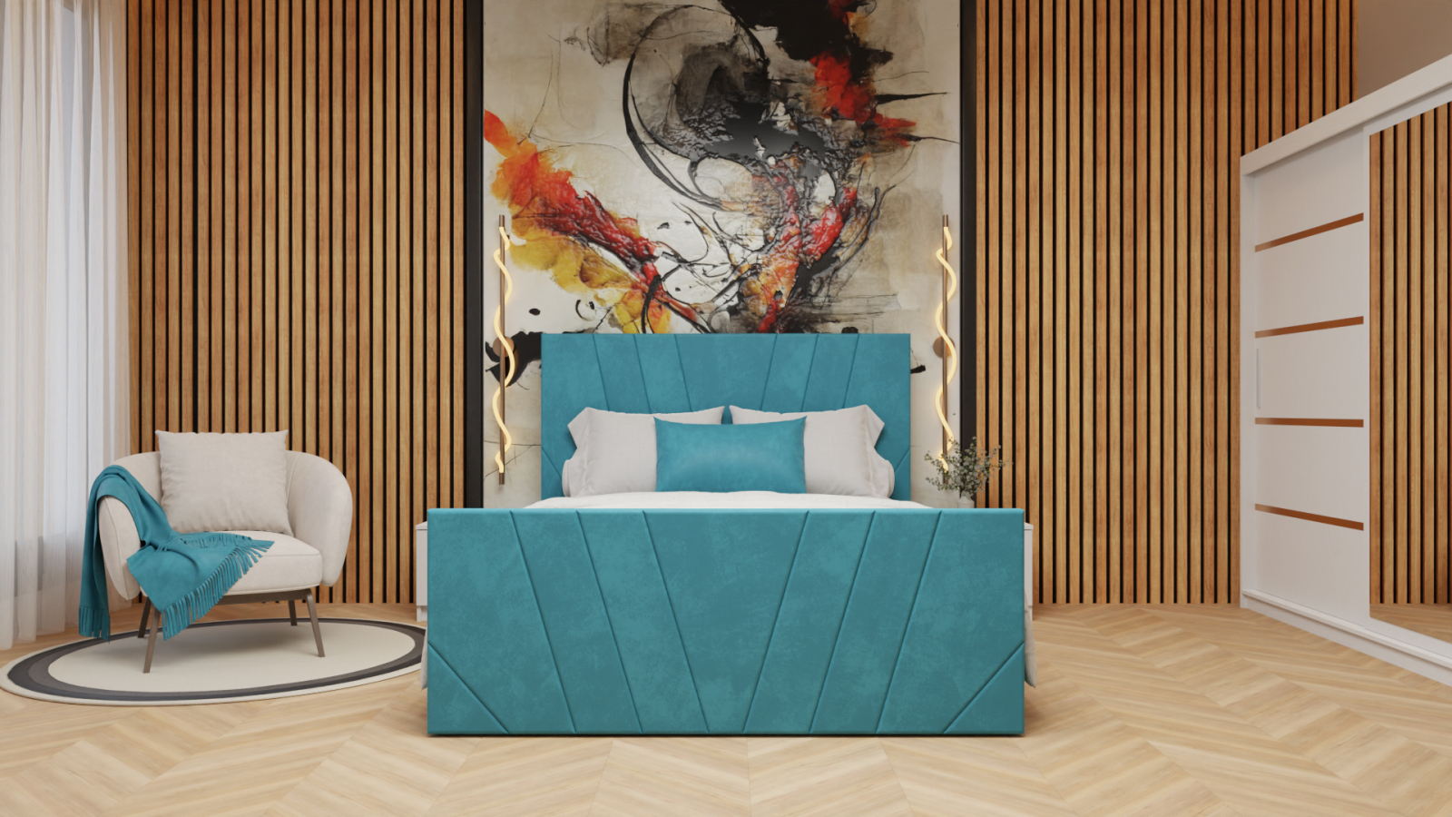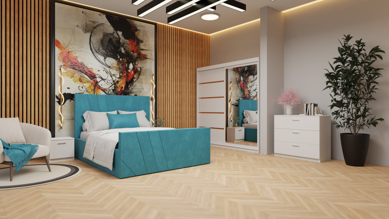 Dormitor Tony Tapitat Stofa Turcoaz cu dulap 200*200 usi glisante Alb cu Oglinda, noptiere si comoda